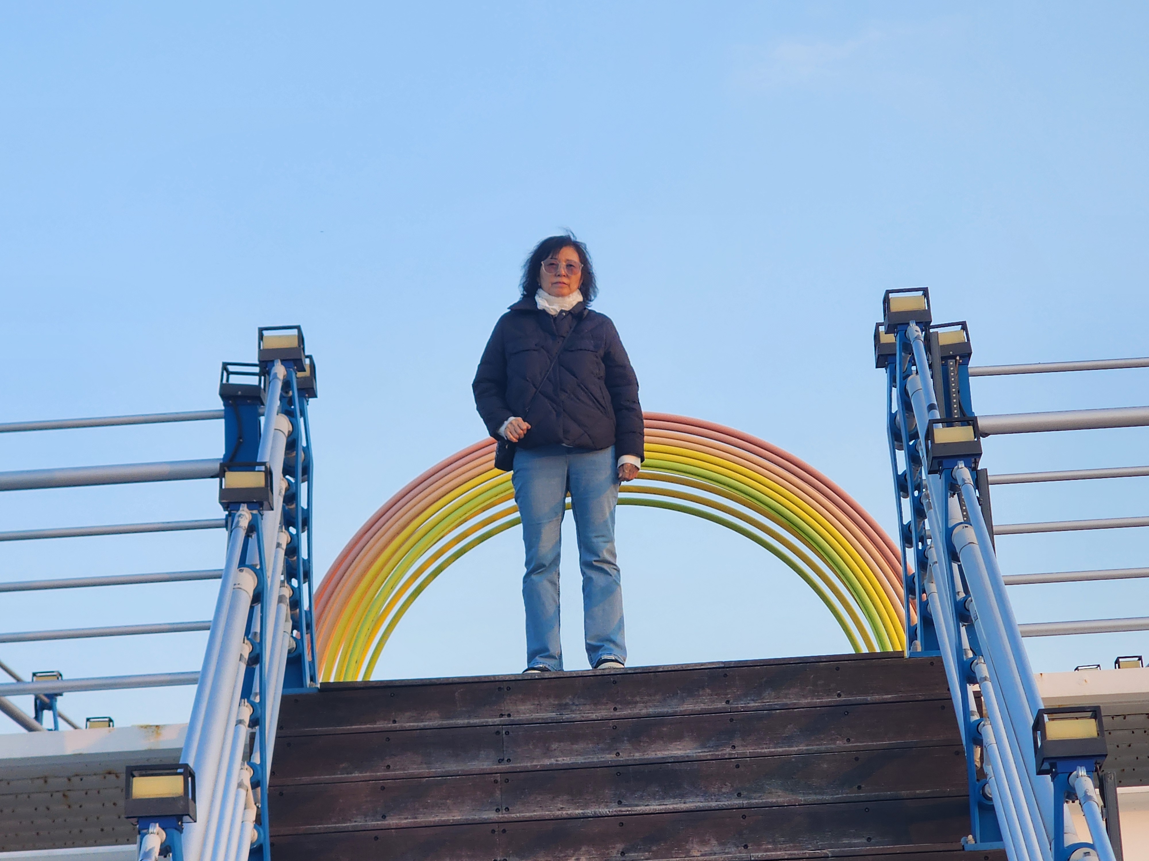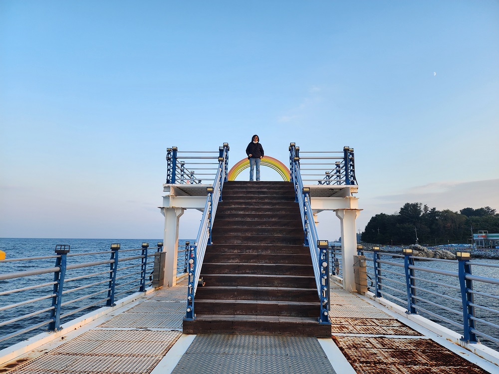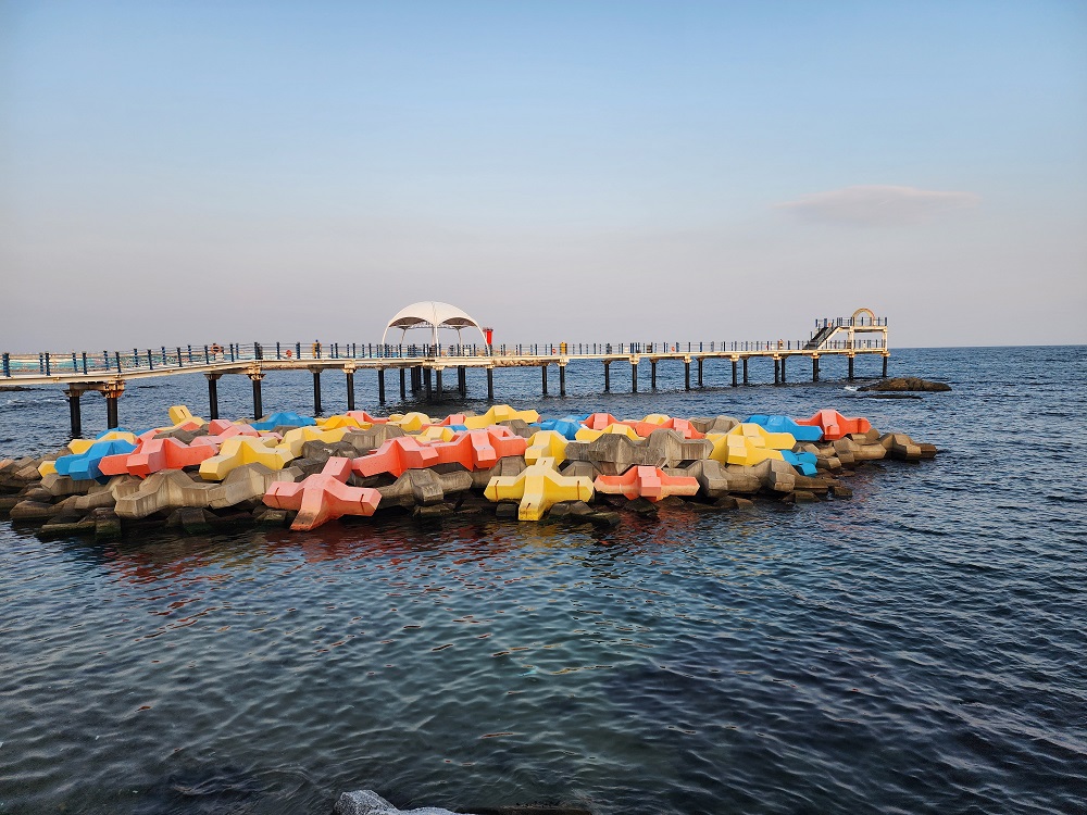 그 옆으로 무지개색으로 칠해진 테트라포트가 바다에 떠 있고