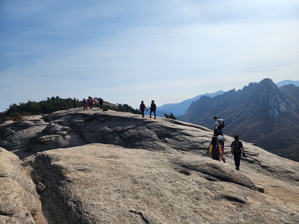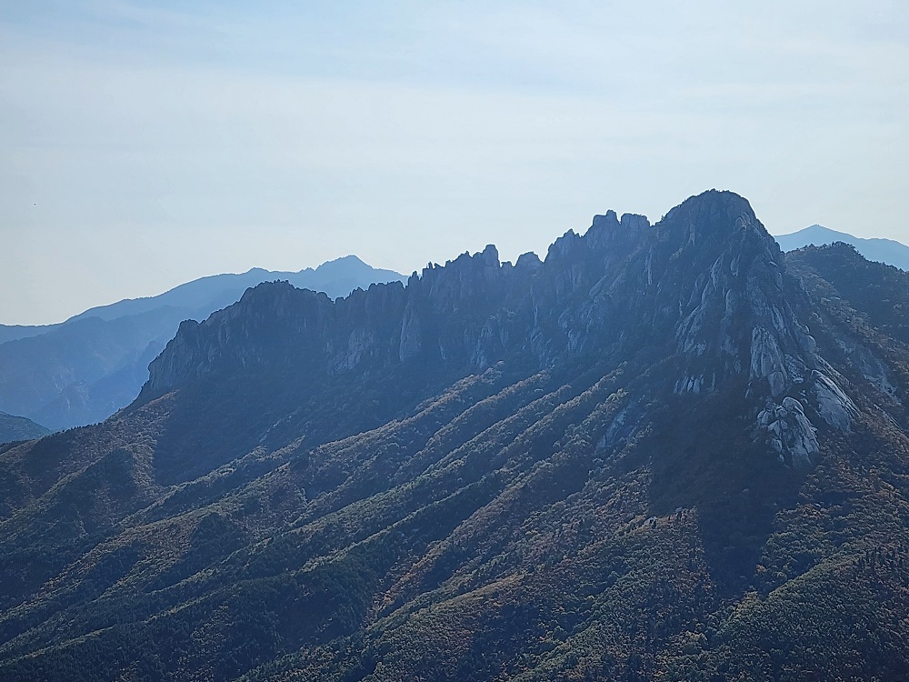 울산바위 뒤로 설악산 대청봉 중청봉이 고개를 내밀고 존재감을 드러내고 있었는데